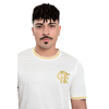 Predominantemente branca, a peça traz o escudo CRF aplicado em dourado no peito, criando contraste elegante e valorizando a tradição rubro-negra sob uma nova perspectiva. A gola careca recebe acabamento em branco com detalhe dourado, repetido também nas mangas, reforçando a harmonia do design.