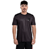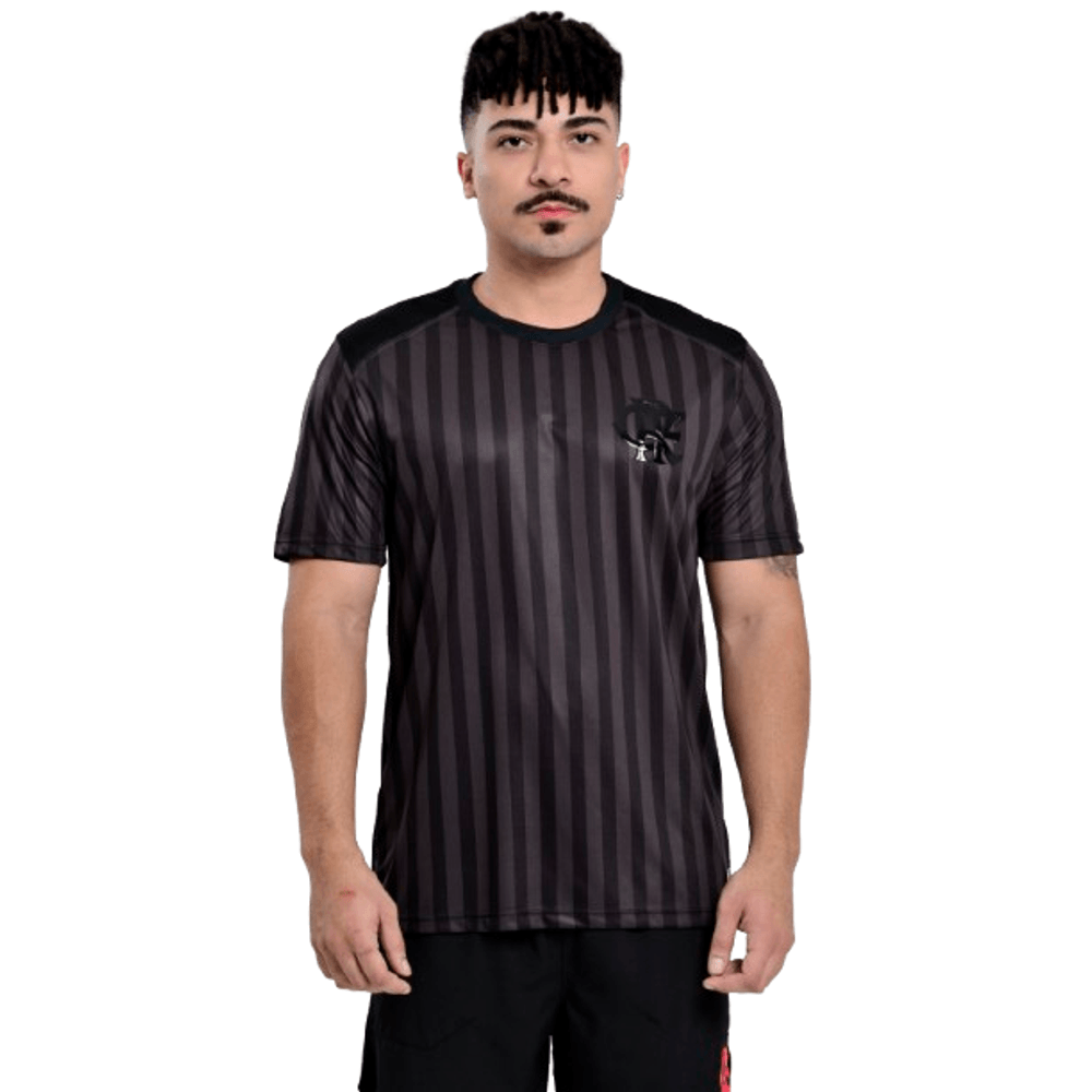 A peça traz padronagem listrada vertical em tons escuros, criando um efeito discreto e elegante. O escudo CRF aparece aplicado em preto com acabamento brilhante no peito, reforçando a proposta monocromática e urbana do modelo. A gola preta completa o design com acabamento clean e contemporâneo.