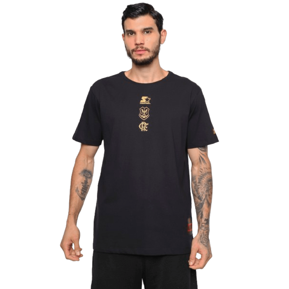 Um clássico urbano com alma rubro-negra. A camisa masculina preta do Flamengo em collab com a Starter é o encontro entre o lifestyle das ruas e a grandeza do clube mais amado do Brasil. O destaque vai para a estampa central no peito, com composição vertical que une o logo da Starter, o escudo do remo e o CRF — três símbolos que carregam história e identidade.