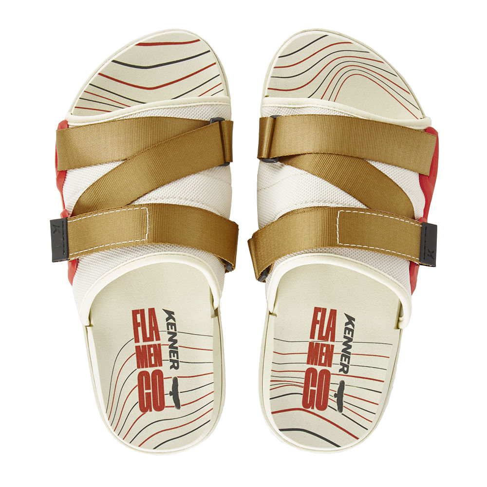 Com cabedal em neoprene na cor baunilha, tiras cruzadas ajustáveis em nylon caqui e solado de borracha vulcanizada, o modelo garante conforto absoluto e aderência em cada passo. A palmilha em EVA extramacia e o detalhe em PVC vermelho completam o visual único que conecta tecnologia, praticidade e identidade rubro-negra.