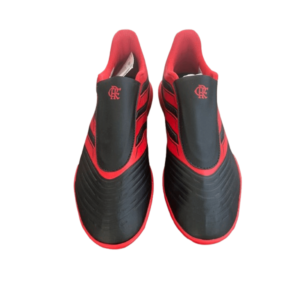 O modelo apresenta visual em preto com detalhes em vermelho, trazendo o escudo do Flamengo aplicado na parte superior. Sua construção sem cadarço conta com cobertura frontal, oferecendo praticidade no calce e um ajuste mais firme durante o uso.