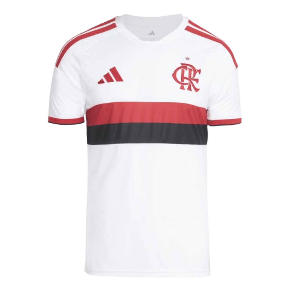 Nos ombros, as três listras da adidas reforçam a tradição, enquanto o escudo do Flamengo com estrela em destaque no peito carrega o peso de uma história que não aceita ser coadjuvante — em lugar nenhum.