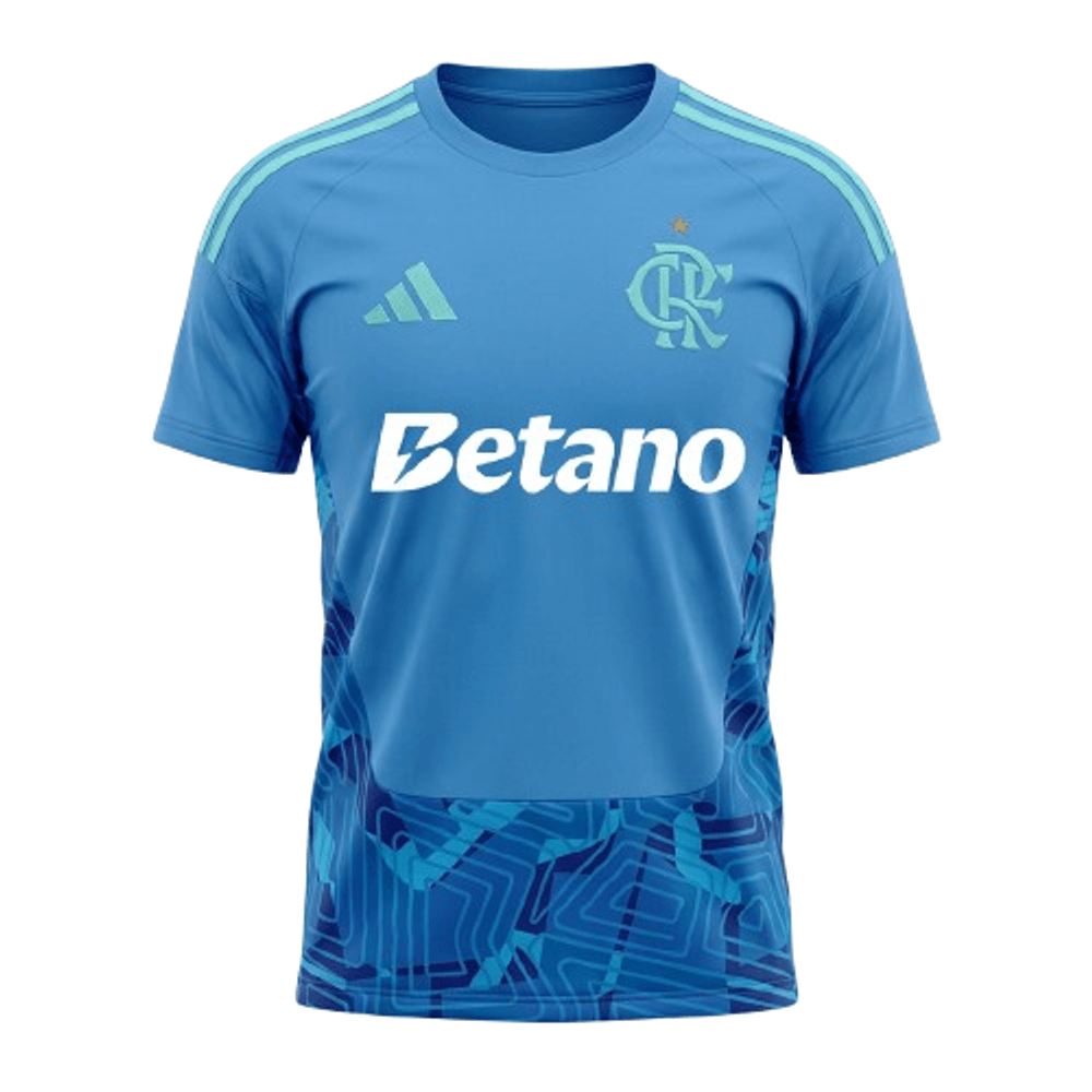 O escudo do Clube de Regatas do Flamengo aparece no peito ao lado do logo Adidas, enquanto as tradicionais três listras nos ombros completam o estilo esportivo da peça. Na parte inferior e nas laterais, os grafismos em tons de azul trazem movimento e um visual diferenciado.