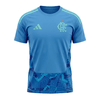 A parte inferior e as laterais trazem grafismos em diferentes tonalidades de azul, adicionando movimento e destaque ao uniforme. Já a parte traseira mantém o visual mais limpo, reforçando a proposta moderna do modelo.
