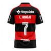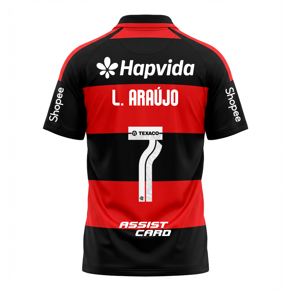 O tradicional rubro-negro permanece como base da identidade do clube, refletindo a força do Flamengo em cada detalhe. No peito, o escudo do CRF simboliza orgulho e história, acompanhado dos patrocínios oficiais que compõem o visual utilizado nos jogos. Nas costas, o 7 de L. Araújo carrega explosão, drible e a capacidade de mudar partidas em uma jogada.
