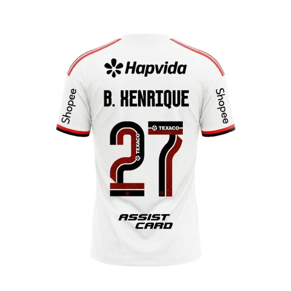 Com base branca imponente e a faixa horizontal em vermelho e preto no peito, o modelo traduz a tradição do clube em uma leitura moderna. Nas costas, o nome B. Henrique e o número 27 ganham protagonismo, representando velocidade, força e decisão em campo.