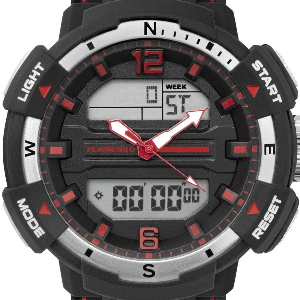 Possui mecanismo Analógico/Digital, a pulseira é na cor Preto, fabricada em Resina, com 26 cm de comprimento, 2,1 cm de Largura e possui Fecho Fivela. O Relógio pesa aprox. 67 g. A Caixa (peça onde fica o mostrador) é fabricada em Metal, possui fundo do tipo Parafusado, mede 4,8 cm de diâmetro, sem considerar a coroa, e 1,7 cm de espessura, o que é considerado tamanho Grande para relógios do gênero Masculino. O Relógio Flamengo Masculino FLAMOBJ4097/8R tem nível de resistência à água especificado em 10 ATM. Com relação as funções adicionais do relógio: possui Calendário Digital, Cronômetro Digital, Um Alarme Diário, Não Possui Timer, Não possui função de Aviso de Hora Cheia (Função Chime), Iluminação de Fundo.