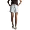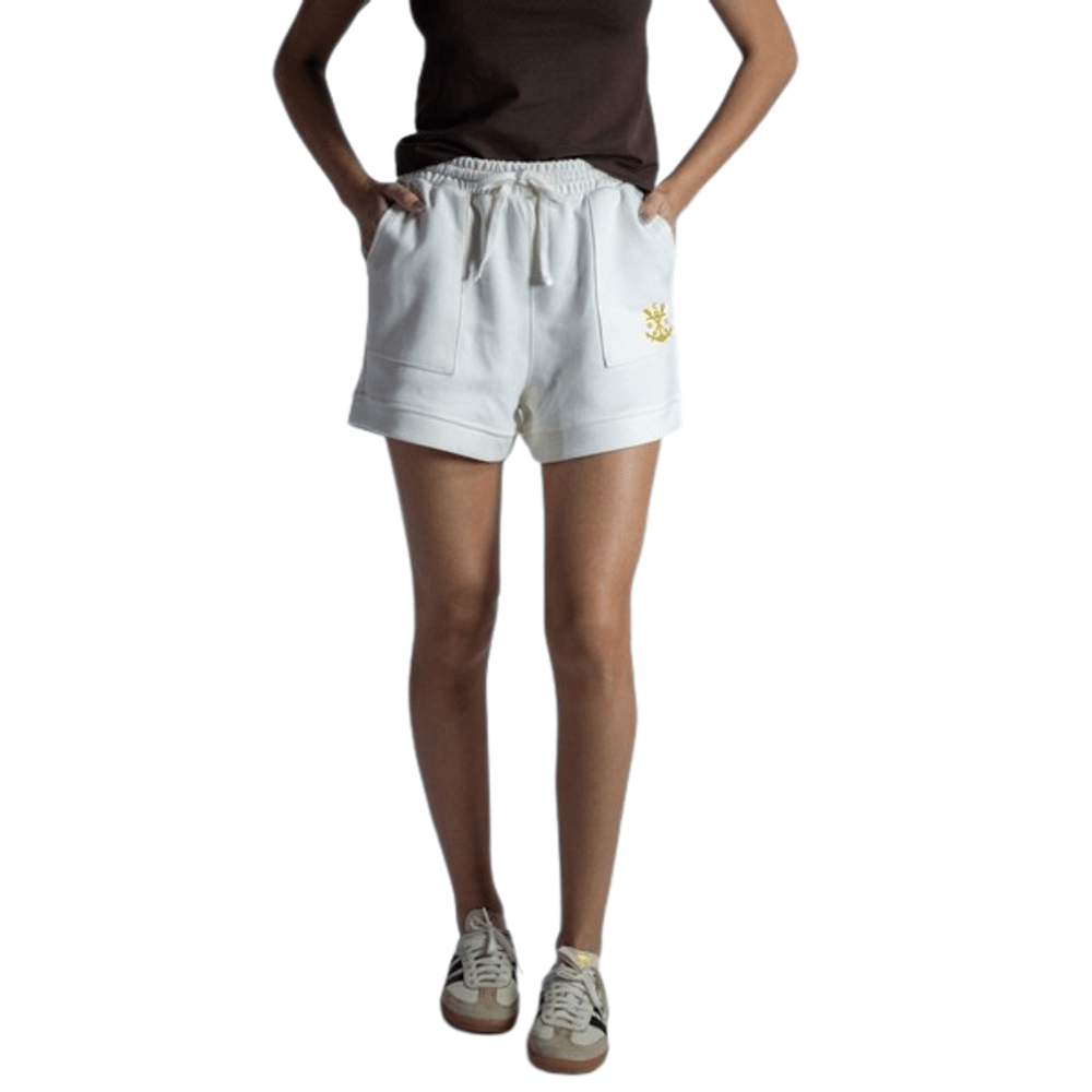 Bermuda feminina em malha Soft Double com cós em elástico e cordão, bolsos quadrados frontais sobrepostos.